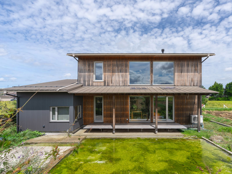 住宅の右下にエアコン室外機が柱の陰に小さく写っています。これは南面。お日様がよく当たる位置にわざわざ付けました。その心は?冬の暖房につかうエアコンにつながっているから(笑)ちなみに、夏の冷房につかうエアコンの室外機は、北側につけています。