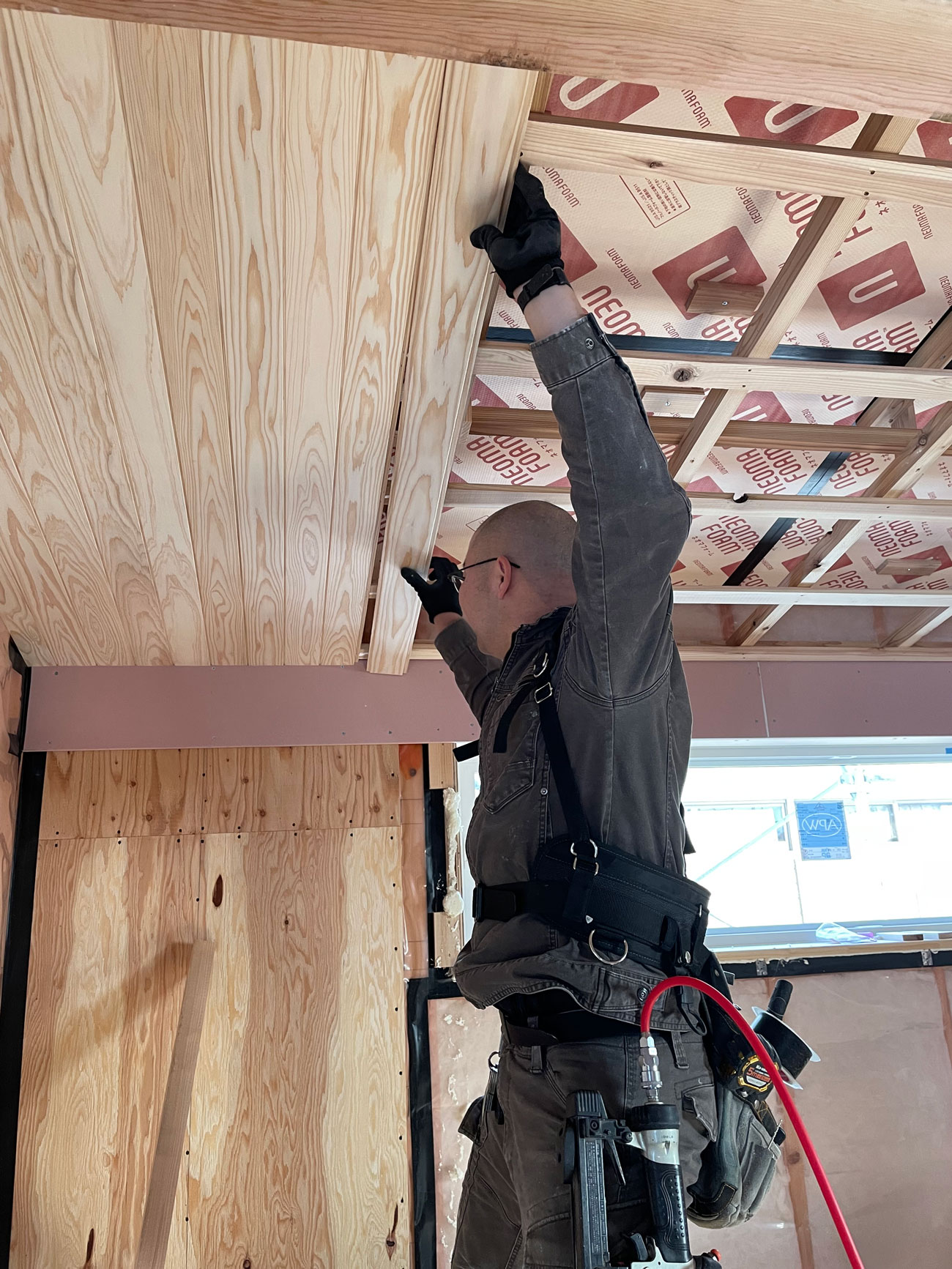 同じような木目が続かいないように注意して羽目板を貼りました。 勾配天井の羽目板仕上は迫力があります。ウレタンフォームでしっかりと断熱・気密処理を行いました。